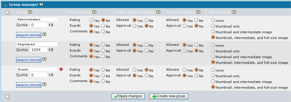Bear in mind that if a user is a member of a group where "Rating", "Comments" or "Public albums upload" is set "YES", s/he will have the right to perform these operations only in albums where they are allowed. ( ie. uploading files will only be possible in albums where "Visitors can upload files" has been set to YES using the album properties screen of particular albums.)