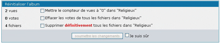 Vous pouvez en cochant les cases, réinitialiser le compteur de vues, effacer les votes, supprimer les commentaires et même toutes les images à la fois dans la sous-section "Réinitialiser l'album" du panneau de configuration de l’album, puis en cliquant sur soumettre les changements. Pour éviter les réinitialisations accidentelles, vous devrez cocher la case "Je suis sûr et certain" avant que des changements puissent être soumis (une croix rouge apparaitra sur le bouton (soumettre les changements) si vous ne l'avez pas fait).